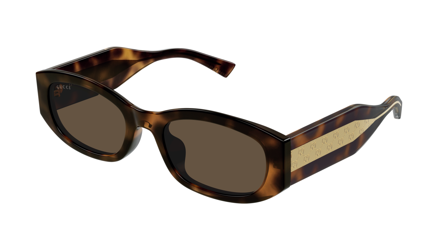 Ideali per chi cerca occhiali da sole Gucci da donna con montatura rettangolare havana, dettagli G Monogram a vista e vestibilità Asian Fit, perfetti per uno stile elegante e contemporaneo.