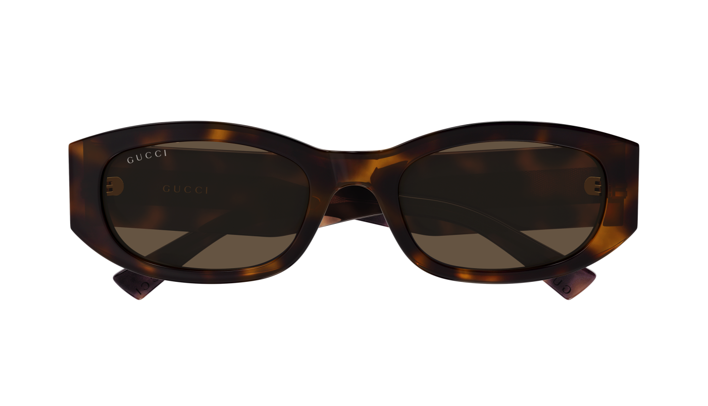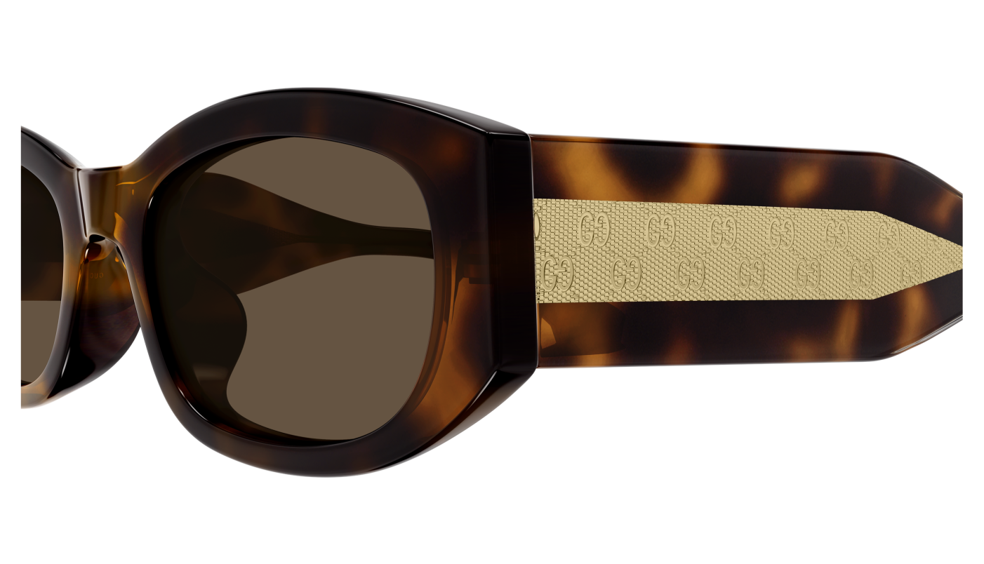 La montatura è realizzata in acetato riciclato color havana con un elegante gioco di trasparenze che lascia intravedere l’anima interna, decorata con motivo G Monogram inciso al laser. La forma rettangolare morbida dona equilibrio e armonia al volto.